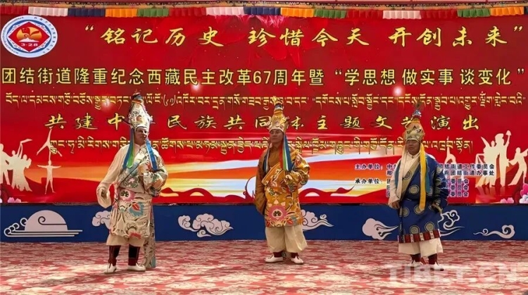 གསེར་རྙེད་ཆུས་མཐུན་སྒྲིལ་ཁྲོམ་གཞུང་གིས་བོད་ལྗོངས་དམངས་གཙོའི་བཅོས་སྒྱུར་བྱས་ནས་ལོ་ངོ67འཁོར་བར་དྲན་གསོ་ཞུ་བའི་བརྗོད་དོན་གཙོ་བོའི་རིག་རྩལ་འཁྲབ་སྟོན་བྱེད་བཞིན་པ།